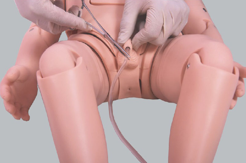 ■ 小儿导尿采用仰卧位体位,应根据年龄选用合适的导尿管,运用该模型可以进行标准的小儿导尿操作训练