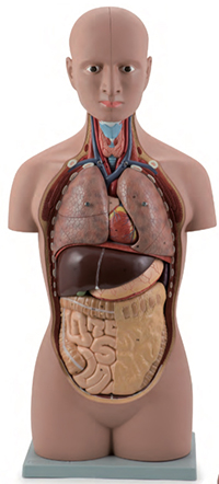 ■ 功能:自然大无性躯干由12部件组成,因为精确的细节刻画,这个模型适用于任何解剖学教学,每一人体结构都标有数字并在相应的说明书是详细说明。头是由两部分组成并可以拆装,显示了脑部的细节。靠近腹侧的颈部解剖,显示了肌肉,腺体,血管神经组织。胸腹部完全打开。共12部件:头(3)左右肺及支气管树和血管(2),心脏(1),肝及胆囊(1),胃(1),胰脾十二指肠(1),大肠小肠带盲肠盖(2),躯壳(1),安放于塑料座上。