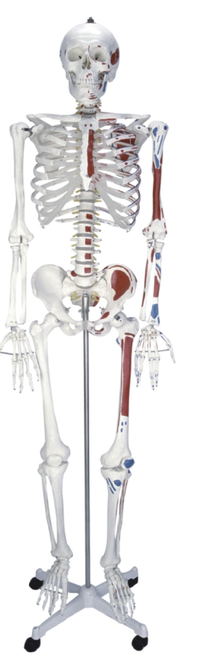■ 功能:显示男性全身骨骼的组成和形态外观,其中四肢骨可以灵活组合,头颅骨和灵活组装,固定在支架上,带底座,可灵活移动。左半侧骨骼用不同颜色油漆标识出肌肉起止点位置;