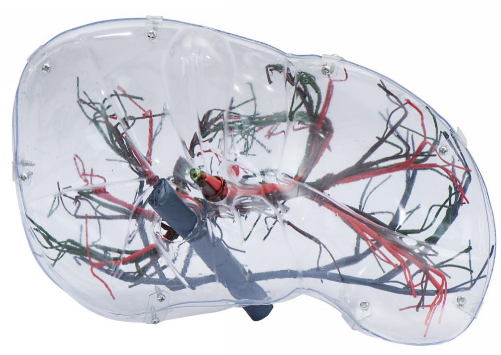 ■ 功能:透明有机玻璃外形显示肝外形特征,白色标志线示肝脏分叶分段,内部分配肝内各管道系统,包括:肝动脉系统(红色)、门静脉系统(紫红色)、肝内胆管系统(绿色)、肝静脉系统(兰色),各管道系统均达三级分支,以显示与肝脏分叶,分段的关系;同时显示第一、二、三肝门的位置、内容,及经由第一肝门进出的肝动脉,门静脉和肝管及其分叉不的相互位置关系;