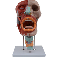 ■ 功能:该模型由头颈部、喉腔正中矢状切面左、右侧半,上、下两部分,以及游离的舌和咬肌、咽缩肌等10个部件组成,并显示颅骨、鼻、口、咽、喉腔正中矢状切面、鼻中隔、面肌、咽肌、游离舌等结构;
