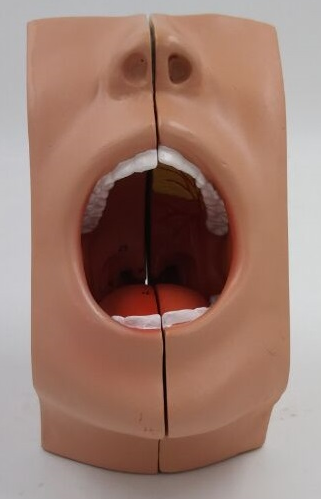 ■ 功能:模型至颈上部在舌骨高度作水平切。主要显示口腔,消化管的起始部。口腔的前壁和侧壁由上、下唇和颊组成,经口裂与外界相通,口腔借牙弓(牙槽突、牙龈、牙列)分成前后二部,前外侧部显示口腔前庭,后内侧部显示固有口腔,其前界及外侧界为牙弓,向后借口咽峡与咽交通,其上壁的前部为硬腭,后部为软腭。模型还显示上、下恒牙的牙冠、扁桃体上隐窝、口咽峡、舌扁桃体、舌体、咽腭弓、腭扁桃体、舌腭弓、腭垂、腭大动脉、腭舌肌及口唇等;