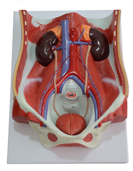 ■ 功能:该模型显示了肾脏,输尿管,膀胱以及子宫等结构,其中右肾打开显示肾内部结构,膀胱和子宫可打开示矢状切面,腹后壁等血管,肌肉结构;