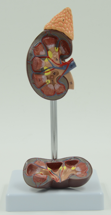 ■ 功能:显示肾上腺的肾的真人大小的模型。模型沿前平面剖切,分为两部分显示内部结构,包括皮质、髓质、带乳头的锥体、部分开放的肾盂、输尿管、血管;