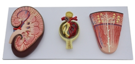 ■ 功能:右肾、肾单位和肾小球合并在一个底板上。整体模型。右肾放大约3倍。从后面看到的正面部分;肾锥体,乳头进入部分开放的骨盆。肾单位及其肾环的示意图。整体模型。肾单位放大约120倍。模型显示两个肾单位,肾、肾小管和集合管系统有小结。整体模型。肾小球增大约700倍。模型显示输入小动脉和输出小动脉、肾小球毛细血管、尿极和鲍曼囊。整体模型;