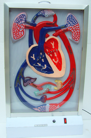 ■ 功能:该模型演示血液在血管内流动的情况,体循环和肺循环的途径;心脏作冠状切面,显示心脏左、右心房,左、右心室及整个心动周期内的搏动状况与血循环的生理机制;