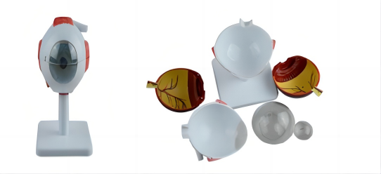 ■ 尺寸:放大3倍;■ 部件:6部件,置于底座上;■ 功能:模型可以在水平面上剖分以显示内部细节。角膜、虹膜、晶状体和玻璃体可以切除。巩膜和部分脉络膜上的肌肉附着也显示出来;