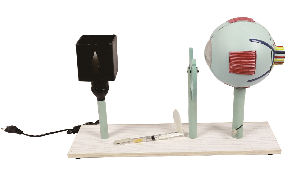 ■ 功能:产品由成人眼球、光源、校正镜片、活动成像显示屏及底座组成。通过眼球前后及在正中与水平成75°切面,示眼球壁三层被膜, 眼球内晶状体(可改变曲率),玻璃体和虹膜。由外向内三层被膜做成梯形切面,并示其各部结构。在眼球后部装一垂直眼球轴的剖面,以示视网膜成像,可调节晶状体,示远视、近视成像;
