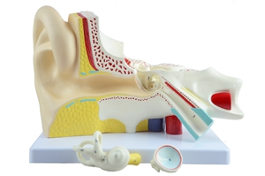 ■ 尺寸:放大3倍;■ 部件:3部件,固定在底座上;■ 功能:模型显示了外耳、中耳和内耳的细节。带锤骨、砧骨和镫骨的鼓膜是可拆卸的。另一部分由耳蜗和迷路及前庭神经和耳蜗神经组成;