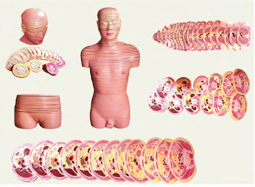 ■ 功能:显示人体男女性水平断面解剖模型结构和形态,将人体从头颈部到盆部整个躯干分解成93片典型部分的结构,由头顶部至坐骨结节作厚约10mm横切片,男女盆腔部可互换;