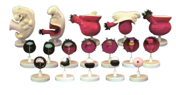 ■ 功能:这套胚胎模型共计17个,显示各胚层、各系统、各器官的各阶段发生,包括有受精卵起一直发生发展到5周末6周初,也就是包括胚前期及胚期的全部内容。具体内容包括胚胎学总论内容;即由细胞团、胚盘、胚体外形发生及演变,中轴器官的发生、三胚层的产生及分化、胚膜的发生,胚胎学各论内容;即各系统以及各器官原基的形态产生以及以后的形态演发过程。