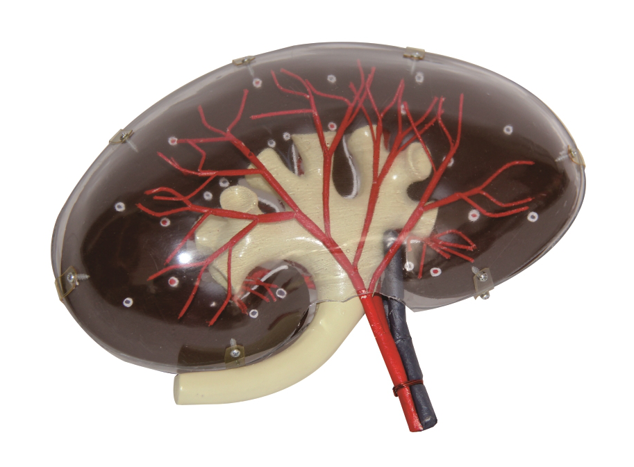 ■ 功能:模型用透明有机玻璃外壳显示肾外形特征,肾内部的肾实质额状切面示皮质、髓质及肾乳头与肾小盏关系、肾窦部的肾小盏,肾大盏及肾盂,肾动脉前后两支在肾实质内肾段动脉分布特征,肾蒂主要结构肾动脉、肾静脉、输尿管的排列关系;