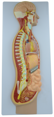 ■ 功能:模型按成人实际标本大小塑制而成,显示自主神经系统结构全貌,自主神经系统由交感神经和副交感神经组成,模型中交感神经呈黄色,副交感神经呈白色。显示的结构:大脑、面神经、三叉神经、额神经、泪腺神经、眶下神经、牙神经 、舌神经、气管、食管腮腺、舌下腺、甲状腺、颈内动脉丛、颈神经、主动脉、腔静脉 肺动静脉 、心 、心丛 灰白交通支、腹腔神经、腰骶神经节、肠系膜神经等;
