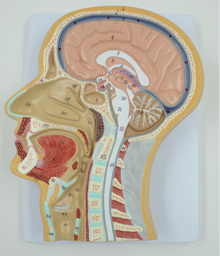■ 功能:此模型是正常大人头正中矢状切浮雕模型,详细地展示了颅骨断面结构、断腔内侧面形态和血管分布,显示了中枢神经系统,口腔、咽、喉的形态结构;