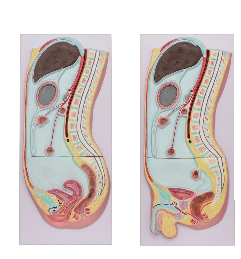 ■ 功能:产品由腹部作矢状切面及男、女盆腔矢状切面组成,男女盆腔可互换。腹膜矢状切面主要示肝、胃、胰、结肠及腹背侧的矢状面和腹膜腔、大网膜、网膜囊、肝胃韧带、横结肠系膜等。男性盆腔矢 状切面主要示直肠膀胱陷凹、以及男性盆腔正中矢状断面上的结构。女性盆腔矢状面,主要示膀胱子宫陷凹、直肠子宫陷凹以及女性盆腔正中矢状切面上的结构;