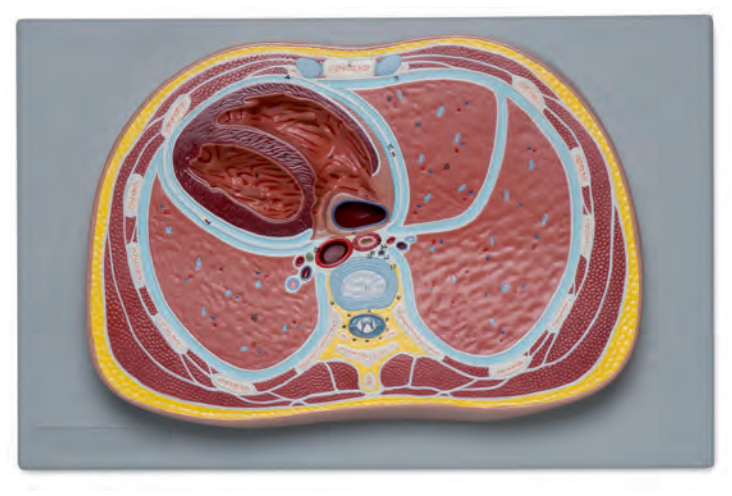■ 功能:模型示约第三胸椎高度示断面结构,按正常解剖姿态平下纵隔作一横切,示肺裂,肺部的动脉、静脉、支气管的断面关系、胸膜、肋间肌及前侧、左右侧胸廓肌肉,同时还可示脊柱、脊髓通过此平面的结构、毗邻关系等,前方示左右心房、心室等;
