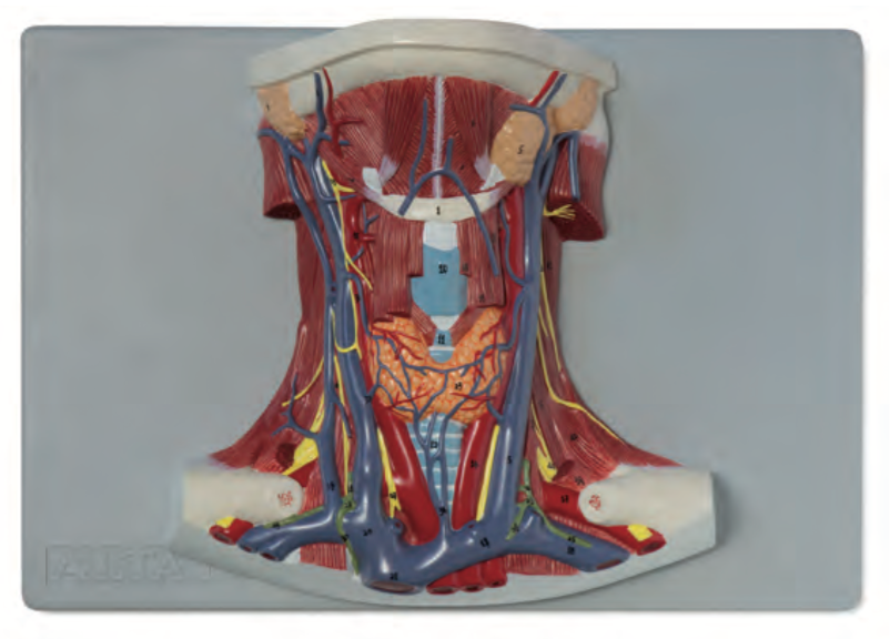 ■ 功能:产品上至下颌骨下至胸骨柄,示颈前部的浅层结构。产品剥离浅筋膜示部分舌骨上下肌群、甲状腺、上腔静脉在颈部的属支,颈总动脉在颈部的分支。上腔静脉在颈部的属支有:头臂干颈内静脉,甲脉腺上中下静脉、颈外浅静脉等。模型上颈总动脉在颈部的分支有:甲状腺上、下动脉, 颈内外动脉、甲状腺最下动脉等,同时还示颈部的浅部神经;