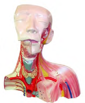 ■ 功能:模型上端自眉弓上方约3cm向颅后至人字缝交叉处作一水平横切,下端平第五肋作一水平横切。在颅腔内示:脑神经的出颅位置,基底动脉,大脑前、中、后动脉起始段,右侧颈部主要示:颈总动脉,椎动脉,甲状颈干,颈浅动脉,甲状腺上、下动脉,舌动脉,面动脉,颈内动脉,颈外动脉及上颌动脉的分支,行走经过,营养范围,同时,还可显示甲状腺,喉软骨,下颌下腺, 颈丛神经的形态、位置等,在胸部主要示气管、支气管、主动脉弓及其分支,肋间血管神经,锁骨下动脉,腋动脉等;
