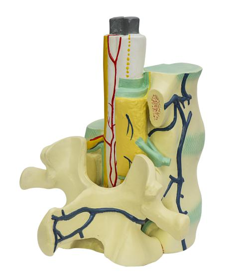 ■ 功能:模型由十二胸椎(做水平和矢状切),第一腰椎和第二腰椎上部及裸露在椎管外的脊髓,脊神经,交感干和椎动脉丛等组成,在十二胸椎的切面上示骨松质和椎间盘的结构特点,沿椎弓做冠状切(可拆装)示:椎管的脊髓,脊髓园柱,终丝,马尾,脊髓表面示:前正中裂,后正中沟,前外侧沟,后外侧沟,脊髓的三层皮膜做剥离示:硬脊膜,蛛网膜,软骨膜及其膜之间的空隙,两侧脊神经根丝组成的前根,后根,脊髓横切面示灰质,白质及其形态特点;