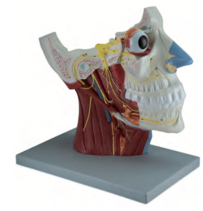 ■ 功能:模型上带部分颅底。眶的上壁和外侧壁已剖掉,暴露出眼球,眼球外肌和眶内神经,下颌支及部分颞骨、颈部浅层肌除去、暴露出脑神经在颈部的分布。颅底内面可见十二对脑神经出入颅底孔裂的情况,在正中面上,上鼻甲粘膜内可见嗅神经丝穿筛孔进入嗅球,切开鼻腔外侧壁暴露翼腭神经节及其分支。眶内显示眼球、眼球外肌, 动眼神经,滑车神经,展神经,三叉神经眼支和睫状神经节的位置的分布。下颌支及颞骨一部已切去,显露三叉神经的上颌神经,下颌神经的走行、分支、分布和下颌下神经节。面神经在面神经管内分出岩大浅神经和鼓索的情况,舌咽神经、迷走神经在颈部走行、分布情况,副神经支配胸锁乳突肌和斜方肌,舌下神经进入舌内等情况;