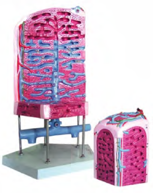 ■ 功能:模型是将人肝的一个肝小叶放大,属五角棱柱形,在肝小叶周边可见到小叶间结蒂组织,内有小叶间动静脉、胆管及淋巴管,并可看到小叶表面的肝板及血窦。并可将模型解剖开,显示其内部的中心静脉、肝血窦、肝板、每个肝细胞的立体外形、肝细胞表面的毛细胆管及肝血窦中枯否化细胞。模型上附有二块特殊部分,一个是透明部分,可透视出肝血窦,以及环绕每个肝细胞的六角形毛细胆管立体网,用于显示肝细胞,肝血窦及毛细胆管三者间的复杂关系。另一个是显示肝小叶外面到中间部的肝小叶部分结构,其中肝血窦大部为横断,其间的肝细胞基本上为一层。在本肝小叶模型下面附有小叶下静脉;