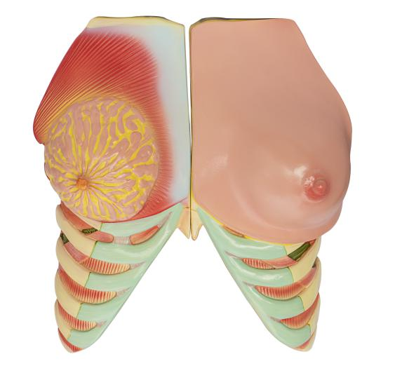 ■ 功能:显示成年女子未授过乳的乳房,左侧示乳房的外形,中心为乳头,周围为乳晕及其乳晕腺,右侧示解剖面乳房的构造、乳腺、乳房小叶、输乳管、输乳管窦、输乳孔以及乳房脂肪、胸骨等内外面结构;