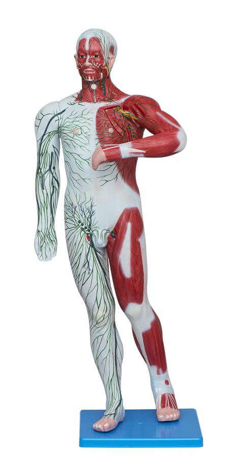 ■ 功能:模型右半显示浅层结构:颈外浅静脉及其属支,上肢头静脉,贵要静脉和前臂正中静脉,下肢大小隐静脉及其主要属支。颈浅淋巴结、肘淋巴结、腹股沟下浅淋巴结的分布位置及它们的收集范围;左半侧主要显示颈深淋巴结和腋淋巴结的配布以及它们各收集的范围,背部浅层肌及淋巴管也有所显示;