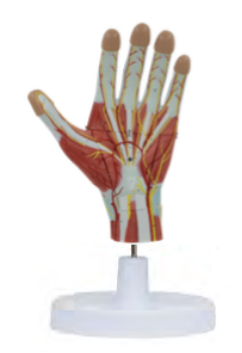 ■ 功能:模型在掌部做有横切,示掌浅、深弓及肌腱、腱鞘、手部肌肉等,附掌部血管神经。手背侧示腕背侧韧带,指总伸肌腱鞘,挠侧腕长,短伸肌腱鞘,拇长伸肌腱鞘,小指固有伸肌腱鞘;切断手背侧总伸肌腱鞘,以暴露骨间背侧肌;手掌侧第一层示腕掌侧韧带手腕横韧带;第二层切断拇短屈肌腱,拇短展肌及小指展肌,小指短屈肌以示拇指对掌肌及小指对掌肌、尺侧囊,指浅屈肌腱,蚓状肌,大鱼际,小鱼际;第三层切断指浅屈肌腱,示指深屈肌腱;第四层显示拇收肌,骨间肌等内容;
