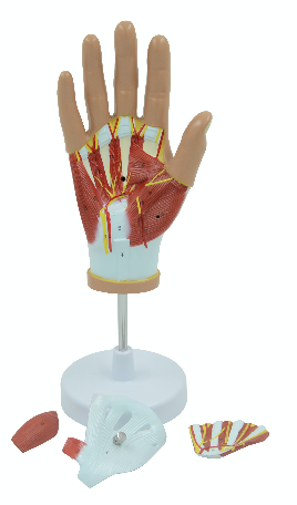 ■ 功能:此模型掌腱膜和掌短肌可以拆下来,以观察更深层的肌肉,肌腱,血管和神经网络。深层的掌部断面出示了长腱、腕部韧带及正中神经。手掌肌部分拆下后,可以看到手掌弓及其分支和神经分布;