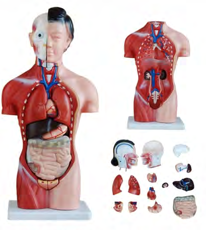 ■ 功能:显示女性人体内脏器官的位置及头部解剖的形态和构造,表现呼吸、消化、泌尿,生殖 等主要人体解剖系统。头颈右半侧显示颅骨、咬肌、颞肌等结构,眼眶内有眼球,在头颈部作矢状切面,颅腔容纳脑的右半球,脑的腹侧面有十二对脑神经,示鼻腔、口腔、喉部示喉腔,喉室、声门裂、甲状腺的外侧叶后面示甲状旁腺。胸腔内的两肺额状切面,显示肺内结构,心脏作冠状解剖,表示左右房室的构造异同,心脏血管有上下腔静脉,肺动静脉,主动脉,供讲解大小血液循环应用;