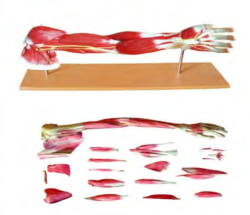 ■ 功能:模型选用标准人体左上肢,去掉皮肤及浅筋膜示上肢浅、深层层次肌肉动、静脉神经,由上肢肌、三角肌、肱三头肌、肱桡肌、旋前圆肌、指浅屈肌、臂丛和腋动脉等19个部件组成,并显示上肢带肌、臂肌、前臂肌前群、后群和手肌等结构,以及显示上肢肌肉的形态、位置、毗邻、起止点,锁骨下动脉的分支、肱动脉的分支、尺动脉的分支、桡动脉的分支和掌深弓、掌浅弓、上肢的尺神经、桡神经、正中神经的分布,上肢的主要静脉回流等;