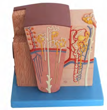 ■ 功能:模型作微观解剖,显示肾脏纵切面、肾脏的皮质与髓质、肾叶的楔形结构、带有短髓袢的肾单位以及血液供应;