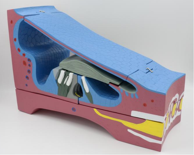 ■ 功能:显示螺旋器及膜性蜗管三壁的立体微细结构,此模型为放大的螺旋器横断面,用于研究耳的声音接收机理;