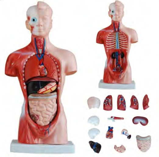 ■ 功能:显示无性人体内脏器官的位置及头部解剖的形态和构造,表现呼吸、消化、泌尿,生殖 等主要人体解剖系统。头颈左半侧显示颅骨、咬肌、颞肌等结构,眼眶内有眼球。胸腔内的两肺额状切面,显示肺内结构。同时显示头颅盖、食管气管和主动脉,心、胃、横膈膜、肝、胰和脾、肠等;