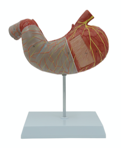 ■ 功能:模型作纵剖,显示:粘膜襞、幽门瓣、幽门括约肌、胃粘膜以及由食管向胃移行之粘膜等构造,区分为前壁、后壁、 胃小弯和胃大弯以及胃壁肌肉走向及内部结构;