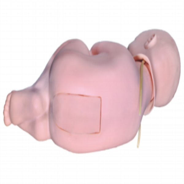 ■ 仿照婴儿真人大小,侧卧于硬板床上,头向胸前弯曲,双膝向腹部弯曲,双手抱膝,腰背尺量向后弓起,也可模拟坐位;婴儿完整头颈部,并有完整的婴儿左右侧两面,额部分布主要血管系统