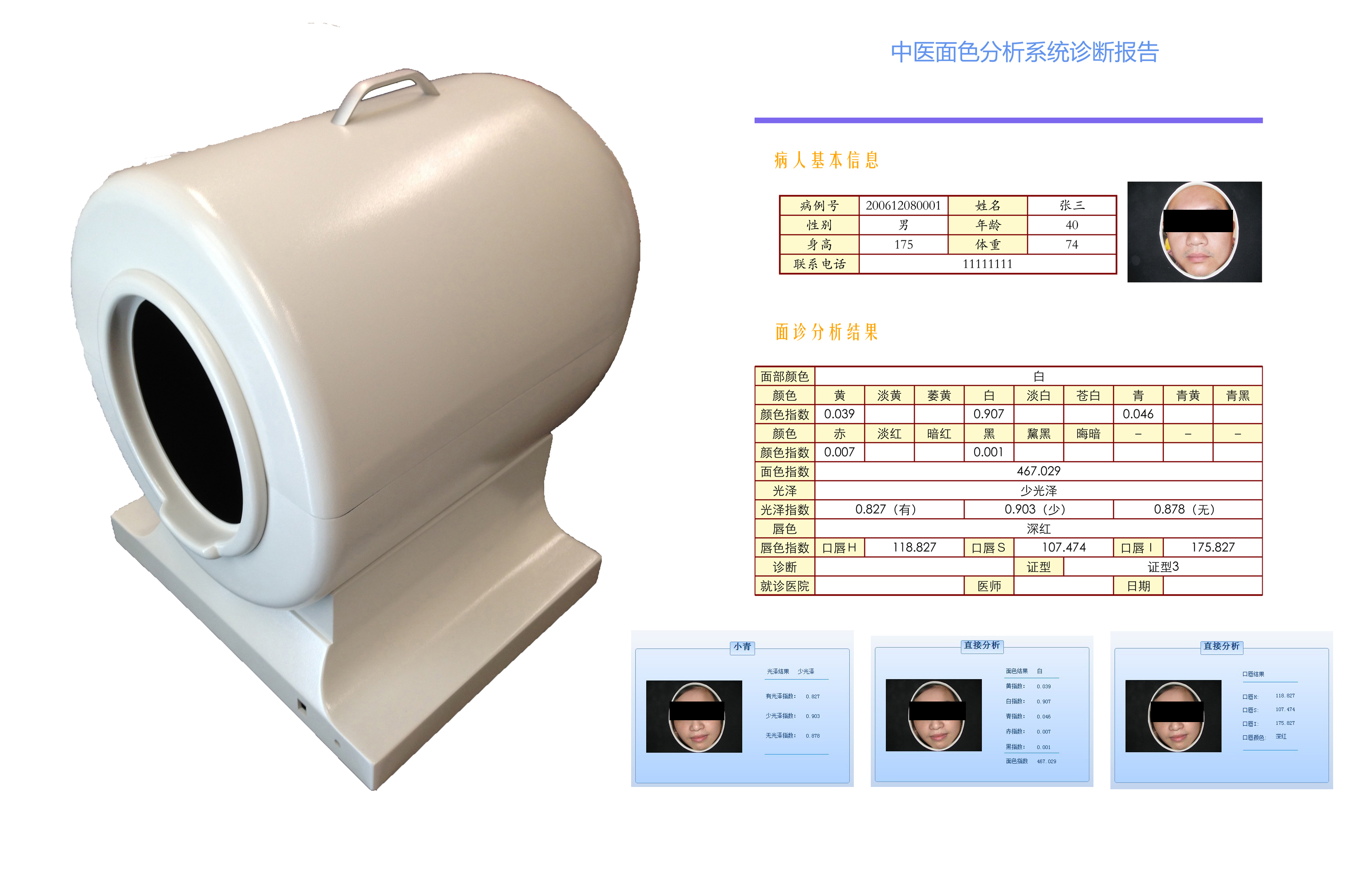 中医面诊检测分析系统从模式识别的角度出发,通过对病人面部图像进行分割,得到面部颜色、光泽和口唇定性定量分析结果,结合医生专业诊断,给出专业诊断结果并打印成报告。该系统能达到辅助中医临床诊断的作用。从数据库中读取面诊信息数据,建立和编辑病例,并对面部图线颜色、光泽和口唇进行分析和判读,建立中医诊断报告。中医舌象分析仪已在上海龙华医院、上海曙光医院试用,采集并分析了几千例舌图像,分析结果与临床诊断符合率较高。